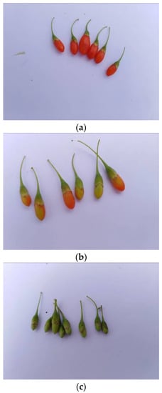 Fresh L. barbarum fruit at different maturity levels. (a) Ripe fruit, (b) half-ripe fruit, and (c) unripe fruit.