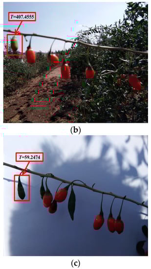 The experiment was conducted in Zhongning in the Ningxia Hui Autonomous Region (37°22′56″ N, 105°37′21″ E) on 28 September 2018. The temperature was 17.6 °C, the humidity was 20.9%, and the illuminance was 357.6 Lx. Ningqi 7 was selected as the experiment variety. Shrubs with good growth and no apparent defects were used; the plants were 4–5 years old with a height of 0.6–1.4 m after pruning. The row spacing of plants was 3 m, and the plant spacing per row was 1 m. Reference reviews indicated that there were significant differences in the pericarp color of different fruits at different maturity levels [16,17,18,22,27,28,29,30,31]. According to the differences of the pericarp color, the fruit can be divided into the ripe fruit, half-ripe fruit, and unripe fruit. Meanwhile, to make the model more universal, different amounts of the three fruits were used to establish the model. This ensured that different amounts of the three fruits were mixed for establishing the model. On this basis, 1828 ripe fruit, 556 half-ripe fruit, and 1164 unripe fruit were selected. The samples were photographed with an industrial camera (type: JHSM1000F-E), as shown in Figure 1.