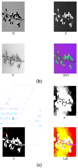 Extraction process of RGB (a), HSV (b), and lab (c) of the unripe fruit.