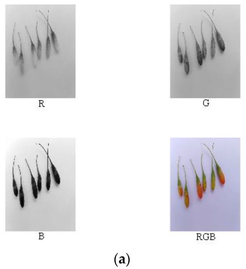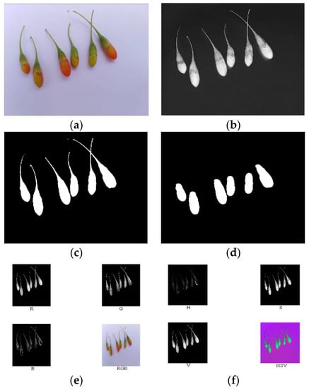 Scholars established the maturity detection models of some fruits using different methods, such as the time-resolved reflectance spectroscopy and computer vision [16,17,18,22,27,28,29,30,31]. Tijskens et al. assessed harvest maturity in nectarines using the time-resolved reflectance spectroscopy. It was a novel technique but too expensive for the current L. barbarum fruit production. Lien et al. assessed tomato maturity using the non-destructive impact test. However, doing the impact test of L. barbarum fruit took too much time. Poel et al. detected tomato maturity based on physiological properties. However, it has been difficult to realize real-time detection of L. barbarum using this method, recently. Aranda-Sanchez et al. determined tomato fruit ripening stages by establishing the Bayesian classifier. Nonetheless, it was difficult to establish the maturity detection model of L. barbarum fruit by establishing the Bayesian classifier. It was widely used to establish maturity detection models based on color information using computer vision in tomato [17,27,28], mango [22], and apple [31]. Based on the above analysis, color information of pericarp was easy to distinguish and had a stable difference compared to other characteristics. In addition, the image processing technology was also mature and convenient. Therefore, we established the quantitative maturity detection of L. barbarum fruit using color information.