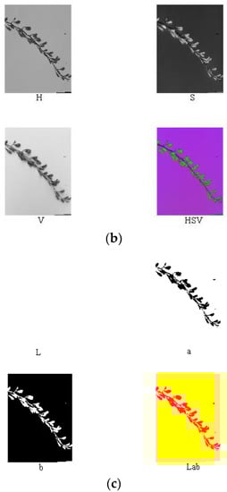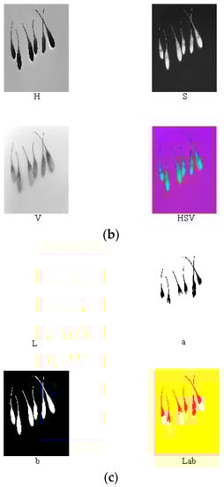 Extraction process of RGB (a), HSV (b), and lab (c) of the half-ripe fruit.