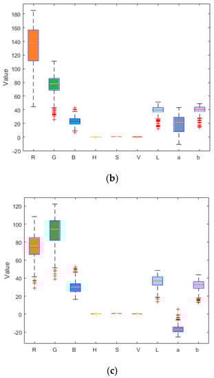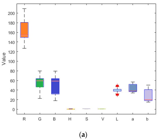 Reference review indicated that RGB, HSV, Lab, and other color models are currently widely used in color systems [17,22,27,28,31]. Nine components (i.e., R, G, B, H, S, V, L, a, and b) of the ripe fruit, half-ripe fruit, and unripe fruit were extracted in Matlab R2010a, as shown in Figure 4, Figure 5 and Figure 6. The mean values of R, G, B, H, S, V, L, a, and b of the ripe fruit, half-ripe fruit, and unripe fruit were 162.8945, 55.0421, 49.1244, 0.3415, 0.7009, 0.6488, 39.5295, 43.5344, and 28.1019; 132.8254, 75.5312, 23.4402, 0.0959, 0.8195, 0.5235, 38.6451, 19.3835, and 38.9981; and 75.5590, 92.7886, 30.0260, 0.2127, 0.6850, 0.3674, 36.6010, 16.7032, and 32.2754. Figure 7 shows the box plots of numerical values of nine components of fruit.