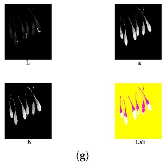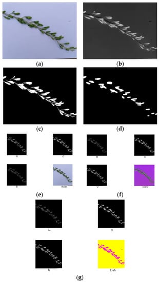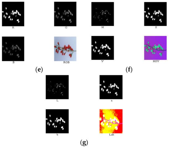 Original image (a), component R—G (b), binary processing (c), morphology processing (d), masks of RGB model (e), masks of HSV model (f), and masks of lab model (g) of the ripe fruit.