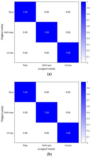 The above samples were used for the field experiment verification. The amounts of the ripe fruit, half-ripe fruit, and unripe fruit were 1828, 556, and 1164, respectively. The ratio of the amounts of samples in the training set to the prediction set was 3:1. The amounts of samples in the training set and the prediction set were 2661 and 887, respectively. After the calculation, the accuracies of both the training set and prediction set were 100%, and the confusion matrixes are shown in Figure 12.