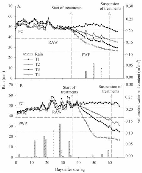 −3 of volumetric soil water content at 47 DAS, close to the permanent wilting point (PWP), corresponding to 0% available soil water content. Ferreira et al. [