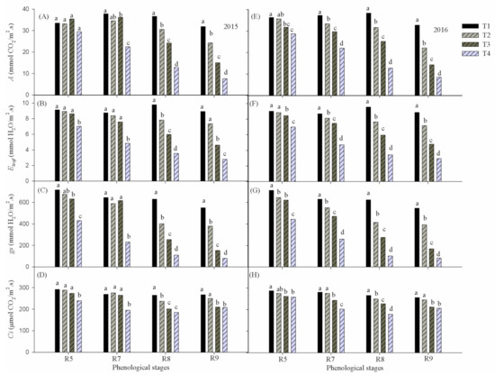 p ≤ 0.05) in phase R7. Between phases R5 to R8, all ecophysiological variables showed, in treatments T2 and T3, respectively, values associated with leaf water potential levels (Ψ