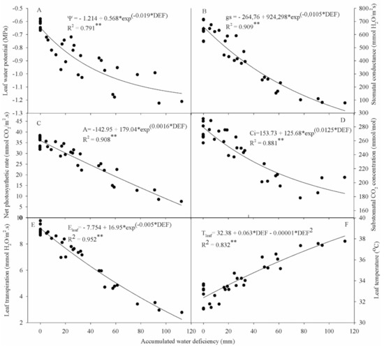 Tleaf) of cowpea over the reproductive phase under different water deficiency values. All variables’ responses were fit to an exponential model (except leaf temperature) that could explain the effects of water deficiency on cowpea ecophysiology variables with high precision, especially