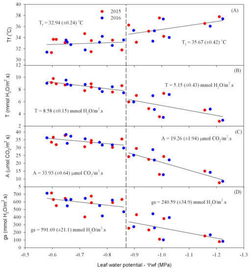 w values of −2.30 and −2.57 MPa, respectively, for common bean submitted to a water deficit. It is important to mention that the leaf water potential can vary according to the crop phenological stage, cultivar, water availability in the soil, vapor pressure deficit, and the time and place of recording [
