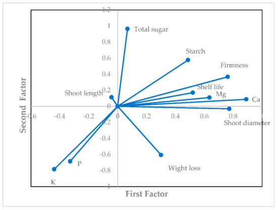 Principal components analysis (PCA) was performed to visualize the relation of the measured factors with principal components. Eigenvalues greater than 1 were selected to extract the main principal components. About 46% and 78% of the changes could be justified considering the first component and with three steps, respectively. Starch, shelf life, calcium, sugar and shoot length achieved high values in three components that could be considered as the most effective variables. Three factors had specific values of more than one with factor analysis by Varimax rotation. About 30% and 78% of the changes could be explained by considering the first and three factors in three components, respectively. Calcium, firmness, total sugar, potassium and shelf life of fruit and shoot length and diameter had high coefficients (Figure 1).