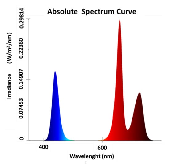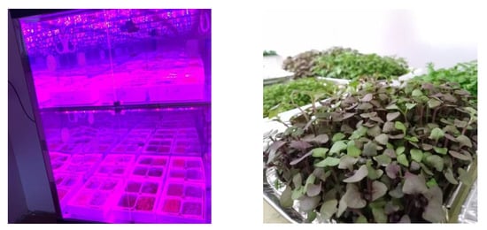 Microgreens of green basil (Ocimum basilicum L.), red basil (Ocimum basilicum ‘Purpurascens‘), and rocket (Eruca sativa Mill.) were grown at the Faculty of Agricultural and Food Sciences of the University of Milan, in a micro experimental growing chamber (MEG®) (Figure 1). The MEG® is a system equipped with LED-lamps, open-source software, automated, developed for home indoor growing. This device utilizes a precision illumination system, composed of LED diodes managed by a smart control system which allows the modulation of the light spectrum composition with emission in 454 nm (blue), 663 (red), and 729 (far-red) and light intensity 65 µmol m−2 s−1, with 12/12 photoperiod (Figure 2). The temperature inside MEG® was 20 °C, and the relative humidity was 60–70%.