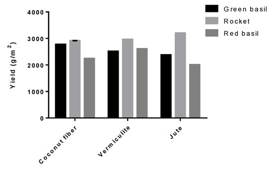 Yield of green basil, rocket, and red basil microgreens grown on three different substrates (coconut fiber, vermiculite, and jute). Values, subjected to two-way ANOVA, are means ± SE (n = 6).