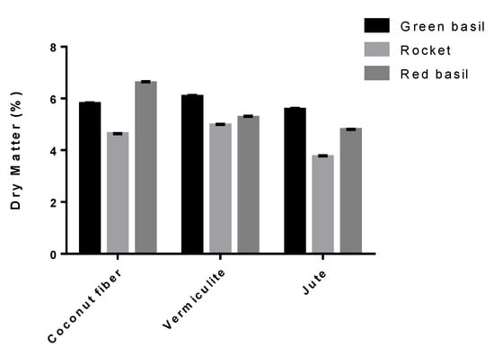 Dry matter of green basil, rocket, and red basil microgreens grown on three different substrates. Values, subjected to two-way ANOVA, are means ± SE (n = 6).