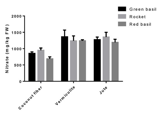 Nitrate concentration of green basil, rocket, and red basil microgreens grown on three different substrates. Values, subjected to two-way ANOVA, are means ± SE (n = 6).