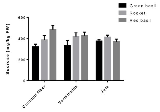 The analysis of sucrose concentration allowed highlighting that the species factor was significant (Table 1). Values ranged from 320 to around 500 mg/kg FW. Green basil microgreens contained the lowest levels. The highest concentration was found in red basil microgreens grown on coconut fiber (484.35 mg/kg FW). The coconut fiber induced different crop performance. Rocket microgreens showed the same sucrose concentrations, around 400 mg/kg FW (Figure 6).