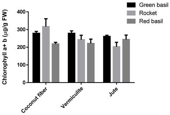 Chlorophyll a + b concentration of green basil, rocket, and red basil microgreens grown on three different substrates. Values, subjected to two-way ANOVA, are means ± SE (n = 6).