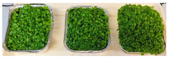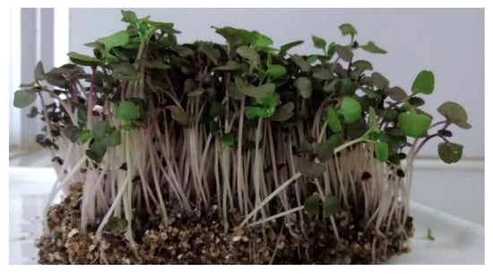 In recent years, microgreens have received increasing attention by producers and consumers thanks to their characteristics of tenderness and crunchiness, specific flavors, vivid colors, and high nutraceutical value, due to the presence of several bioactive compounds such as antioxidants, vitamins, and macro and micro-minerals [1,2,3,4,5,6,7,8]; for these reasons they are usually considered as functional foods [9,10]. Based on the current literature, there is also a growing interest from researchers, confirmed by the amount of papers published on this topic [11]. Microgreens are immature greens, harvested and marketed as soon as the first leaves are developed and the cotyledons are still tender [12]. They can be obtained from vegetables, herbaceous plants, aromatic herbs, and spontaneous species [2,3,13]. Size varies from species to species, but normally they are between 2.5 and 8 cm in height [14]. The growing cycle is short and varies between 7 and 21 days from the emergence of the seedlings. The shoots are harvested by cutting them just above the roots and are eaten raw either alone or in mixed salads or used as a garnish for dishes. Microgreens can be also commercialized in boxes with substrates, without harvesting. This strategy allows longer shelf life and wide opportunity for the commercialization. One of the major limitation of microgreens is their rapid quality deterioration that occurs soon after harvest, and so restricts their commercialization to local sales [6]. From the point of view of cultivation technique, microgreens are very suited for indoor production [8]; they are often grown in hydroponic systems on different substrates [15]. It is important to underline that hydroponic systems could be a sustainable alternative to conventional farming, as they require less water, fertilizer, pesticides, and space for the crops cultivation [16,17,18,19]. Moreover, in recent years, vertical farming systems have emerged as a potential solution for urban horticulture, with interesting positive implications in terms of reduced environmental impact [20], thanks to the shortening of the food supply chain, to the reduction of waste and fossil resources for transportation, with a consequent decrease of CO2 [21]. These systems are also less affected by climate change, being performed in a protected environment [22].