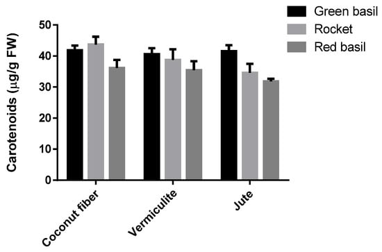 Carotenoid concentrations of green basil, rocket, and red basil microgreens grown on three different substrates. Values, subjected to two-way ANOVA, are means ± SE (n = 6).