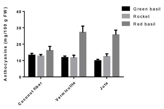 Statistical analysis showed that for anthocyanins the interaction between substrate and species was significant for p < 0.05 (Table 1). The species factor had a significant effect for p < 0.0001. As could be expected, red basil microgreens showed higher anthocyanins levels (up to 27.16 mg/100 g FW) compared to rocket and green basil, in particular this species grown on vermiculite and jute showed the highest values. The lowest concentration can be found in green basil on jute (9.89 mg/100 g FW) (Figure 10). The species factor was significant also in the case of phenolic index (Table 1). Red basil microgreens grown on vermiculite (Figure 11 and Figure 12) and jute reached the highest levels (6.44 and 7.37 ABS320 nm/g respectively); green basil showed in general lower values compared to the other species considered.