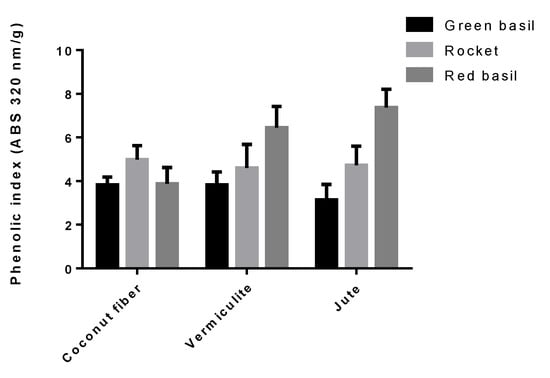 Phenolic index values of green basil, rocket, and red basil microgreens grown on three different substrates. Values, subjected to two-way ANOVA, are means ± SE (n = 6).