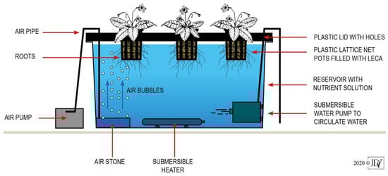 A closed deep water hydroponic system with an air stone and a circulating pump was used based on the recommendations, discussions and methodologies of [11,37,38]. Deepwater hydroponics allows for methods of heating the nutrient solution to the required temperature and maintains a consistent nutrient supply and temperature over the entire root surface area of the replicates. Closed hydroponics systems allow for the reuse of nutrient solution, reducing the negative environmental impacts such as leaching of fertilizers, soil and groundwater pollution, and water wastage while saving on labor. LECA provided support for the plants needing to be suspended in the nutrient solution while providing excellent aeration qualities [11,36].