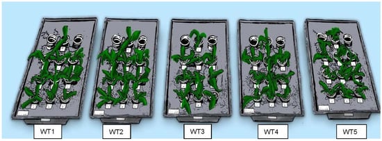 There was an interaction between root zone water temperature and final leaf length produced by the plants with a highly significant F-statistic (F1,4 = 49.02, p ≤ 0.0001). The 18 °C (WT1) treatment with a mean of 36.22 cm had the highest reading compared to the control 26 °C (WT3) treatment, mean 6.68 cm, or any of the other treatments by the final 8th week of the experiment (Table 2). There was thus a significant reduction in the rate of leaf length development at both WT2 22 °C (15.85 cm) and WT3 (6.68 cm), with a further reductive loss in leaf length in WT4 30 °C (−2.18 cm). This sharp decline was visually observed in the leaf health, quality and length, as temperature increases to 34 °C (WT5) compared to the control WT1 of 18 °C (Figure 4) yielded the largest increase in leaf length.
