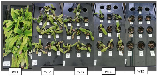 Conversely, the lowest temperature of 18 °C (WT1) significantly increased the inflorescence formation of S. formosus. Flowers were evident at lower root zone temperatures of 18 °C and 22 °C compared to the control treatment at 26 °C (WT3) or the higher temperatures. Increasing water temperature in the range from 26 °C to 34 °C not only decreased inflorescence formation but led to total fatality of the plants at the highest temperature of 34 °C (WT5), as seen in Figure 6. A positive finding is that at 18 °C (WT1) flowers did develop during colder short-day periods, which indicates a strong possibility that manipulating the growing temperatures could induce S. formosus to flower earlier in the season, thereby extending the flowering period for an all-round year commercial marketing period.