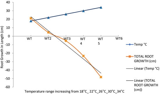 The statistical analysis in Table 2 indicates the greater significant values (F1,4 = 69.63, p ≤ 0.0001) with root growth than with the aerial parts of the plant, and indicates that WT1 (18 °C) demonstrated a notable 210.5 cm overall increase in root length, compared with only 4.5 cm at WT2 (22 °C), versus the overall negative growths of −5.4 cm for the control WT3 (26 °C) and −23.3 cm at WT4 (30 °C) treatment, with the complete death of the roots at WT5 (34 °C) treatment. Figure 5 presents the treatment interaction effect on the total root growth of the S. formosus plants and it indicates that heat in the root zone is a severely limiting factor when heating above a critical temperature range. Root zone temperatures at 22 °C resulted in poor root development and all the temperatures above resulted in no development and sharply declining growth or death of the S. formosus plant’s root system.