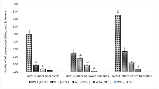 The relationship between root zone water temperatures and inflorescence formation. Note: The bars presented here are means ± SE. Bars with different letters are significantly different at p ≤ 0.01 (**) (total number of flower and buds; overall inflorescence formation) and p ≤ 0.001 (***) for the total number of pedicels as calculated by Fisher’s least significant difference.