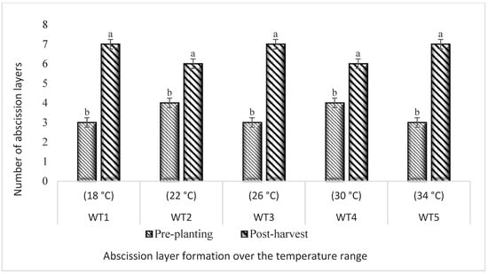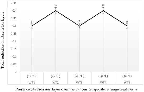 The correlation between all root zone water temperature treatments and the decrease in abscission layers that were present at the start, as compared to the complete absence of abscission layers at the end of the study. Note: Bar graphs presented here are means of the number of abscission layers ±SE. The mean values followed by the same letters are not significantly different (ns) at p ≤ 0.05 as calculated by Fisher’s least significant difference.
