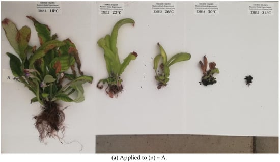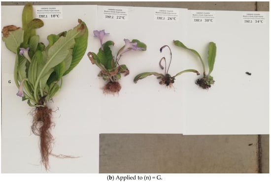 Streptocarpus formosus responded in various ways to different temperature regimes with a clear trend that resulted in the death of the leaves and roots at higher temperatures (26 °C to 34 °C), with the most optimal growth at the lower temperature of 18 °C. It is also clear that the roots were more sensitive than the shoots. Treatments applied in this investigation had a significant effect on the vegetative root and leaf growth as well as the overall fresh weight of S. formosus. The results obtained from this research disagree with various previous studies which yielded positive results in other leafy perennials and crops at higher temperature ranges such as 24 °C–28 °C for spinach [56]; 25 °C–30 °C for tomatoes and lettuce [20]; 25 °C–45 °C for muskmelon plants [57]; and 15 °C–30 °C, for Chrysanthemum with an optimum temperature of 24 °C [49].