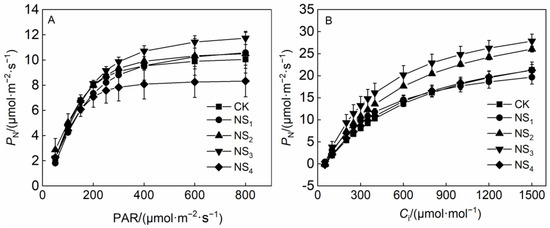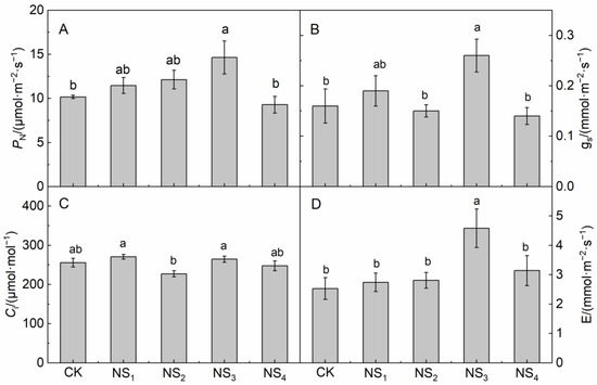 The values of PN, gs and E in the NS3 treatment were significantly higher than those in the CK (Figure 1A,B,D). However, the values of PN, gs and E in the NS1, NS2, NS4 and CK treatments showed no significant difference. The values of PN, gs and E in the NS4 treatment were significantly lower than those in the NS3 treatment (Figure 1A,B).