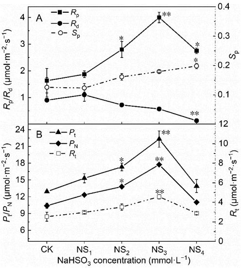 Photorespiration related parameters ((A): Rp, Rd and Sp; (B):Pt, PN and Rt) under different concentrations of NaHSO3. Significant differences between the control and treatment groups are indicated by asterisks (* p < 0.05, ** p < 0.01). Rd: the dark respiration rate; Rp: the photorespiration rate; Sp: the photorespiratory portion; PN: the net photosynthetic rate; Pt: the total photosynthetic rate; Rt: the total respiratory rate.
