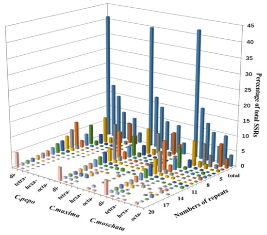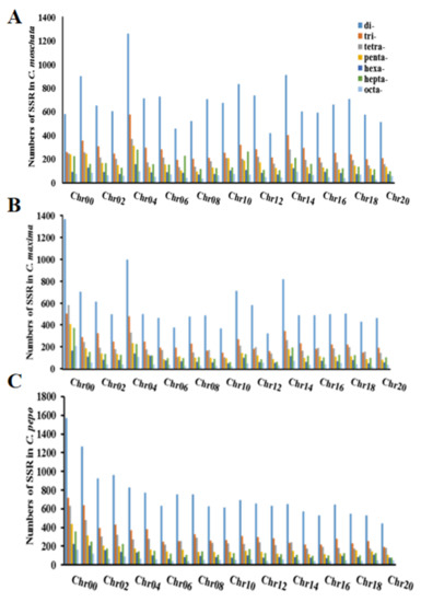 Here, we analyzed repeat types ranging from di-nucleotide to octa-nucleotide. Among all of these nucleotide motifs, di-nucleotide motifs (41.0%) were the most common type, accounting for 41.78%, 39.90%, and 41.01% of the total SSR loci discovered in C. moschata, C. maxima, and C. pepo, respectively, followed by tri-nucleotide motifs (16.97%, 19.19%, and 17.88%, respectively), whereas octa-nucleotide motifs (3.78%, 3.76%, and 3.38%, respectively) were the least represented repeat type in the three Cucurbita genomes (Table S2). In general, the frequency of the total SSR loci decreased with the increase in motif length, except for hepta-nucleotide SSRs.