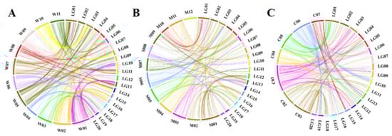 Syntenic relationships of C. pepo with (A) C. lanatus, (B) C. melo, and (C) C. sativus. Chromosome synteny between C. pepo and C. sativus was based on 391 cross-species markers; synteny between C. pepo and C. melo was based on 425 cross-species markers; synteny between C. pepo and C. lanatus was based on 717 cross-species markers. W1–W11 represent C. lanatus’ eleven chromosomes, M01–M12 represent C. melo’s twelve chromosomes, C01–C07 represent C. sativus’s seven chromosomes, and LG01–LG20 represent C. pepo’s twenty chromosomes. Syntenic blocks are connected by the same color lines from C. pepo chromosomes.