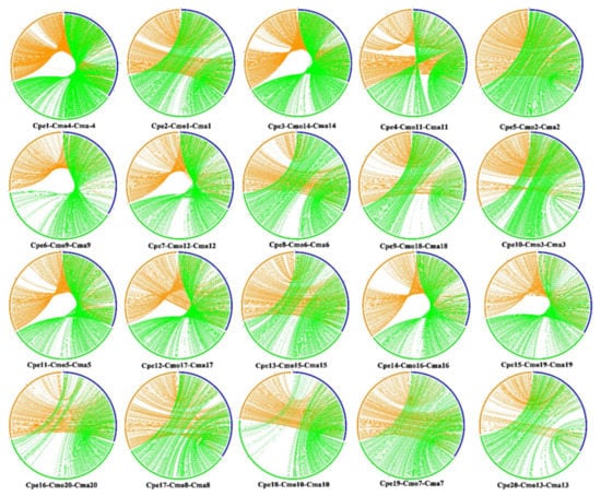 Chromosome synteny of C. pepo (blue) with C. moschata (green) and C. maxima (yellow). The physical positions of chromosomes of each crop in the figure are arranged clockwise. Chromosome synteny between C. pepo and C. moschata was based on 14,276 cross-species markers; synteny between C. pepo and C. maxima was based on 10,655 cross-species markers. Cpe1–Cpe20 represent C. pepo’s twenty chromosomes, Cmo1–Cmo20 represent C. moschata’s chromosomes, and Cma1–Cma20 represent C. maxima chromosomes. The syntenic relationship between C. pepo and C. moschata are connected with the green color lines, and the syntenic relationship between C. pepo and C. maxima are connected with the yellow color lines.
