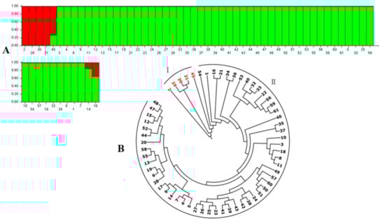 The genetic diversity of the 61 accessions based on SSR markers. (A) Population structure of 61 accessions in C. pepo by the model-based analysis. The scale of the y-axis represents the percentage of genetic components, and the x-axis represents the different materials. (B) Phylogenetic tree of 61 accessions in the C. pepo by UPGMA analysis; Group I (red makers) and Group II correspond to the structure analysis.