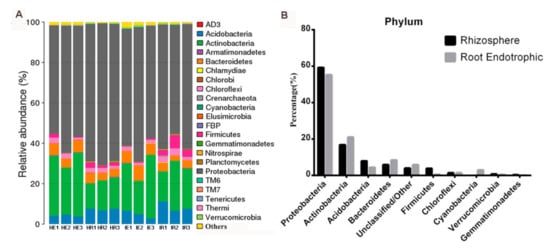 Citrus root endophytic and rhizosphere bacterial community structure. (A) Stacked bar graph showing bacteria at phylum level. The ratio of each species in a certain sample is displayed. The phyla with an abundance of less than 0.5% were classified into ‘Others’. (B) The distribution of citrus root endophytic (gray) and rhizosphere (black) bacteria for the top ten bacteria phyla. HS: rhizosphere in healthy samples; HE: endophytes in healthy samples; IS: rhizosphere in CLas-infected samples; IE: endophytes in CLas-infected samples.