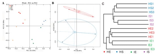 Comparison of the rhizosphere and endophytic community structures based on pyrosequencing of 16S rDNA amplicons and metagenomics. (A) Principal coordinates analysis (PCoA) based on 16S OTU abundance. Number in brackets represents contributions of principal components to differences among samples. A dot represents each sample, and different colors represent different groups (red: HE; blue: HS; orange: IE; green: IS). (B) Principal component analysis (PCA) based on gene abundance. Number in brackets represents contributions of principal components to differences among samples. A dot represents each sample, and different colors represent different groups (red: HS; blue: IS). (C) Unweighted pair group method with arithmetic mean (UPGMA) analysis based on 16S OTU abundance (HS: rhizosphere in healthy samples; HE: endophytes in healthy samples; IS: rhizosphere in CLas-infected samples; IE: endophytes in CLas-infected samples).