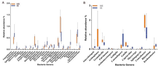 Composition of bacteria abundance of root endophytic compartment (IE and HE) and rhizosphere (IS and HS) between CLas-infected and healthy citrus at the genus level. (A). Rhizosphere difference genera. (B). Endogenous difference genera. The y axis represents the relative abundance of each bacteria genus. The p-values of all the genera presented in the figure were less than 0.05.
