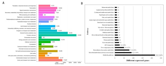 To explore the genetic composition and function of the citrus rhizosphere microbial community, we blasted the genes identified by metagenomics with the eggNOG database sequences. A total of 211,088 genes were annotated. Among these, amino acid transport and metabolism (17,047 genes, 8.08%), energy production and conversion (13,732 genes, 6.51%), and carbohydrate transport and metabolism (12,157 genes, 5.76%) are the top three functional classifications (Figure 4A).