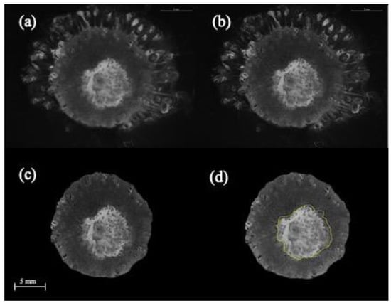 Visual scoring of digital images (VSDI) method of inoculated basal plate image for calculating FBR severity using Fiji ImageJ©: (a) raw image of an FOC-infected basal plate, (b) improving the image for better contrast, (c) manual cropping of the total basal plate area of interest, (d) manual demarking of the FOC infection to calculate infected area percentage in pixels or FBR severity. Bar length = 5 mm = 224 pixels or 44.8 pixels/mm, pixel aspect ratio = 1.0.