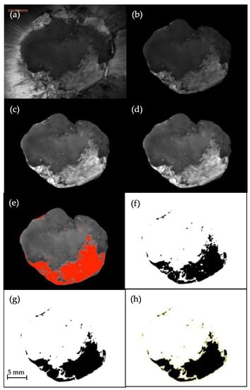 The same digital images that were used in the VSDI method were also used for this analysis. After setting up the same scale as the VSDI method, the images were enhanced for contrast by normalizing the histogram as mentioned for the VSDI method (Figure 2c). A ‘Gaussian Blur’ filter was applied to reduce the noise and smooth out edges (Figure 2d). Subsequently, the images were subjected to an automatic multilevel thresholding method [29] to generate a reproducible result and avoid biases (Figure 2e). The threshold images were transformed into binary images by creating a mask (Figure 2f). If any image had gaps within the infected portions, it was filled by the ‘Fill holes’ function (Figure 2g), and the infected areas were selected to measure the total infection area (Figure 2h). A custom ImageJ Macro script was written to include all the steps and perform high-throughput segmentation of the FOC infection in the basal plate. This language is easy to learn and use by a person with little or no experience in coding. The percentage severity of FBR was calculated as described above for the VSDI method.