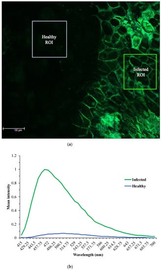 (a) A digital image of FOC-infected onion basal plate was captured by confocal microscopy. (a) Autofluorescence from the infected and healthy basal plate tissue, (b) a graph showing the difference of the fluorescence emission intensities between two selected regions of interest (ROI) from the infected and healthy basal plate tissue. Bar length = 100 µm.