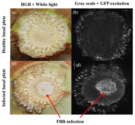A comparison of digital images of healthy (a,b) and FOC-infected (c,d) onion basal plates captured with white light (a,c) and after GFP excitation (b,d). FBR symptom was indicated using the red arrows. White light images, captured by a Nikon© 3200 DSLR camera, give the readers a perspective of visual scoring. Microscopic images were captured using a Leica© M165FC Stereo-Fluorescence microscopy equipped with a Green Fluorescent Protein -1 dual filter (excitation filter—425/60 nm (395–455 nm); barrier filter—480 LP). Bar length = 5 mm = 224 pixels or 44.8 pixels/mm, pixel aspect ratio = 1.0.