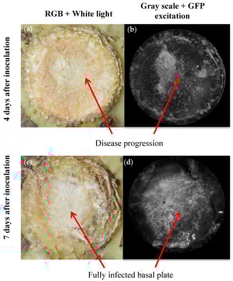 Among four different filters, the gray-scale images of the inoculated basal plates captured by the GFP dual filter generated the best contrast between the healthy and the infected basal plate areas (Figure 4). With bright autofluorescence from the FOC infection, symptoms were elucidated (Figure 5), and the disease progression on the basal plates was clearer (Figure 5) than was for the visual scoring (Figure 4 and Figure 5).