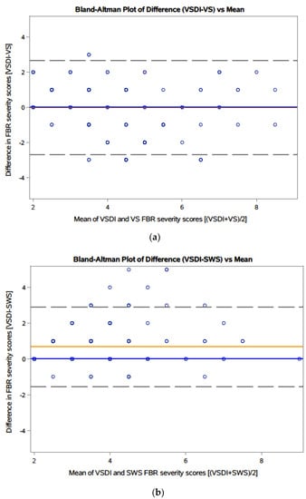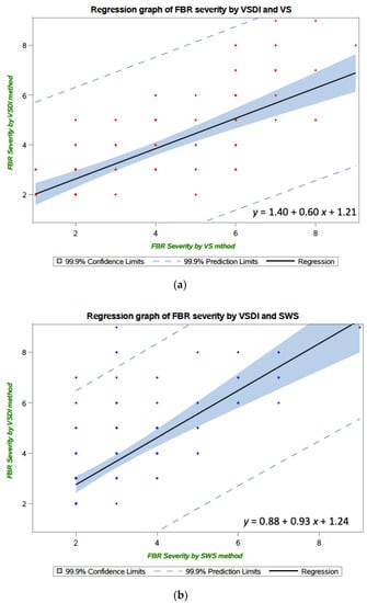 The Bland–Altman plots further revealed that the mean of the difference between the VSDI and VS methods coincided with the reference line at 0 (Figure 7a). This result indicated that FBR severity measurements obtained by the VS method were not very different than those measurements obtained from the VSDI method, and that there is no bias in estimating actual disease severity by the VS method.