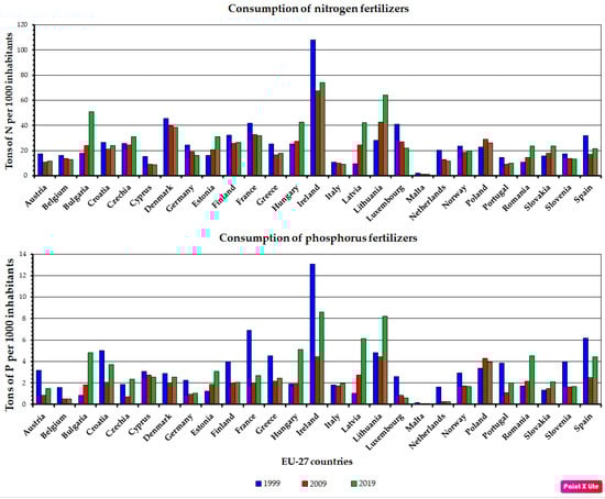 The trends of N and P consumption by 1000 inhabitants with respect to more than twenty years ago in the European countries are represented in Figure 1. Here, each country showed a peculiar trend. In most cases, however, and when focusing particularly on 1999 and 2019, the trends were declining (except for several Eastern countries such as Bulgaria, Czechia, Estonia, Hungary, Latvia, Lithuania, Poland, Romania, and Slovakia). This evidence fits well with the increase in the agricultural demand and related land used occurring in these countries. Interestingly, similar trends can be observed for N and P fertilizers.