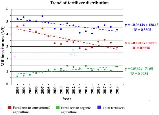 Trends of the fertilizer distribution, in million tons of the main nutrient elements, in Italy from 2003 to 2019. The upper blue line is for total fertilizer consumption and is equivalent to the sum of all kinds of fertilizer products used in both conventional (red line) and organic (green line) agriculture. The equation and the R-square value of the linear regression trendlines are displayed on the right of the graph. Total fertilizers include all types of fertilizers reported in Table 3. Data source: ISTAT (https://www.istat.it/en/legal-notice (accessed on 20 June 2020)), [].