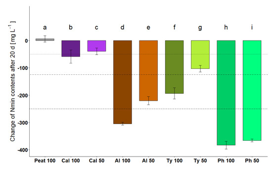 In order to gain information on the mineral nitrogen demand of the different raw materials in plant experiments, the Nmin budget of the processed raw materials was determined (Figure 2). All treatments except Peat 100 immobilized mineral N over the incubation period in stage 1. According to VDLUFA, the mineral N budgets of Peat 100 and Cal 50 were stable (change of Nmin contents lower than 50 mg N L−1; [24]) followed by Cal 100 and Ty 50, which were slightly instable (change of Nmin contents between 51 and 125 mg N L−1), whereas Ty 100 and Al 50 were instable (change of Nmin contents larger than 125 mg N L−1). Al 100, Ph 100, and Ph 50 showed very high N immobilizations (larger than 250 mg N L−1), which would lead to an exclusion as a component for growing media according to the definition of VDLUFA [24]. According to the principles of the test procedure, treatments were adapted in stage 2 (Al 25 and Ty 25 instead of Al 100 and Ty 100), and reed was excluded from further analyses (see also [13]). This adaptation resulted in an improvement of the N stability of Ty 50 and Ty 25 for cattail and Al 25 for alder [13].