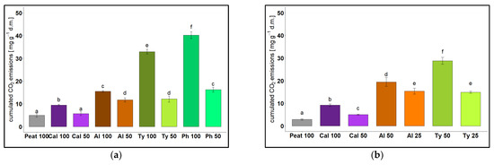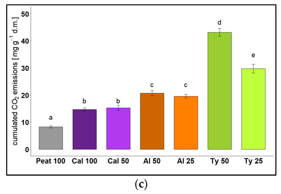 The amount of emitted CO2 during a two-week incubation experiment served as a measure of microbial activity and therefore degradation stability of each treatment [36]. In stage 1, all treatments were incubated at their natural pH without liming (Figure 3a). Peat 100 showed the lowest CO2 emissions due to the enrichment of stable organic compounds during peat formation and a strongly acidic pH (3.2). Cal 100 showed only slightly higher CO2 emissions since easily degradable compounds were already degraded during composting. The highest CO2 emissions were found at Ty 100 and Ph 100, since cattail and reed showed a low level of processing and still contained large amounts of easily degradable compounds such as hemicellulose and cellulose (Table 7). Al 100 showed a medium level of microbial activity due to its high contents of lignin in comparison to Ty 100 and Ph 100 (Table 7). A mixture with peat resulted in a significant decrease of CO2 emissions among all processed raw materials, which may also be due to a decreasing pH value from slightly acid (Cal 100 5.2, Al 100 6.2, Ty 100 5.4, Ph 100 5.1) to stronger acidic (Cal 50 4.0, Al 50 3.9, Ty 50 3.4, Ph 50 3.4). However, correlation between pH value and CO2 emissions over all processed raw materials and treatments was not significant (R2 = 0.22, p < 0.05). There was also no significant correlation between the total organic carbon content and the CO2 emissions over all treatments in stage 1 (R2 = 0.21, p < 0.05) and in stage 2 (R2 = 0.13, p < 0.05).
